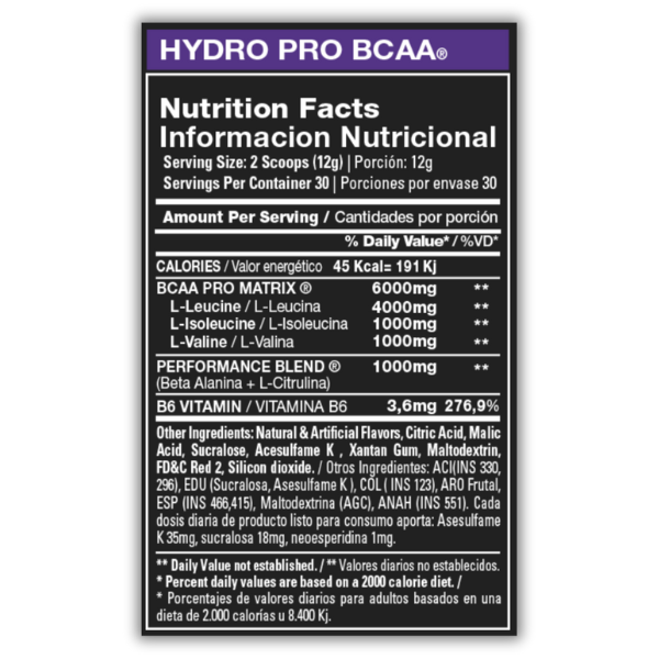 Ingredientes: L- Leucina 4000 mg, L-Isoleucina 1000 mg, L-Valina 1000 mg, Beta Alanina+ L-Citrulina 1000 mg, Vitamina B6 3,6 mg.
