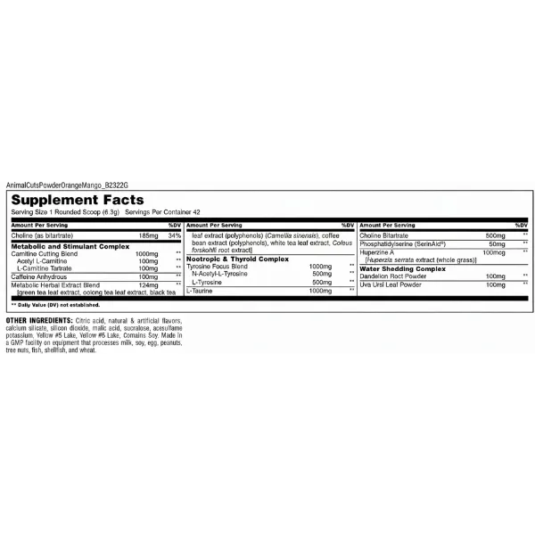 Animal Cuts Powder es la versión en polvo de nuestro suplemento para quemar grasa y definir, con 17 ingredientes diseñados para acelerar el metabolismo, suprimir el apetito, ayudar a definir la musculatura, favorecer la salud cerebral y colaborar en el control del peso. Este termogénico “todo en uno” está formulado para hombres y mujeres que buscan reducir de manera natural el exceso de grasa y líquidos.