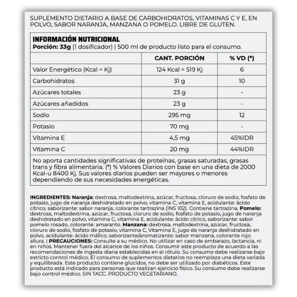 Su exclusiva fórmula, fuente de vitaminas C y E, aporta carbohidratos, retrasa la fatiga y mejora el rendimiento físico.