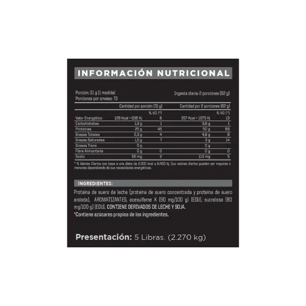 Ultra Concentrado de Proteína de Suero Lácteo, Aislado de Proteína de Suero Lácteo, Hidrolizado de Proteína de Suero Lácteo, Cacao, ARO: Sabor Chocolate, EDU: Sucralosa (40mg/100cm3), EDU: Potasio Acesulfamo (30mg/100cm3), Col: Caramelo.