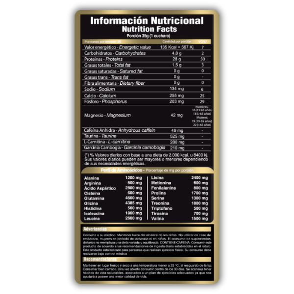 28gs de Proteínas* de suero lácteo con alto valor biológico, encargada de aumentar la masa muscular aportando un optimo equilibrio de aminoácidos escenciales (EAAS) y aminoácidos de cadena ramificada (BCAA).