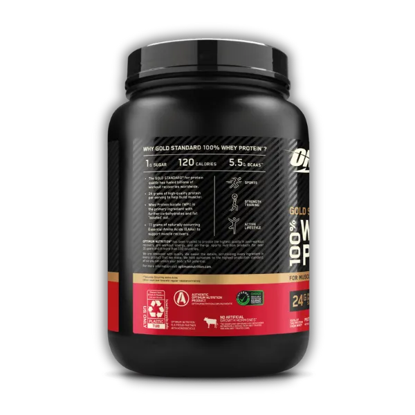 Descripción del producto: Optimun Nutrition Gold Standard 100% Whey es una proteína en polvo de suero de leche de alta calidad que proporciona 24 gramos de proteína por porción. Está formulada para apoyar el crecimiento y la recuperación muscular, y es ideal para consumir después del entrenamiento o como un complemento a tu dieta diaria.